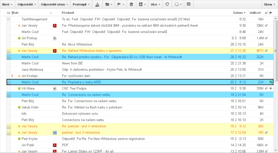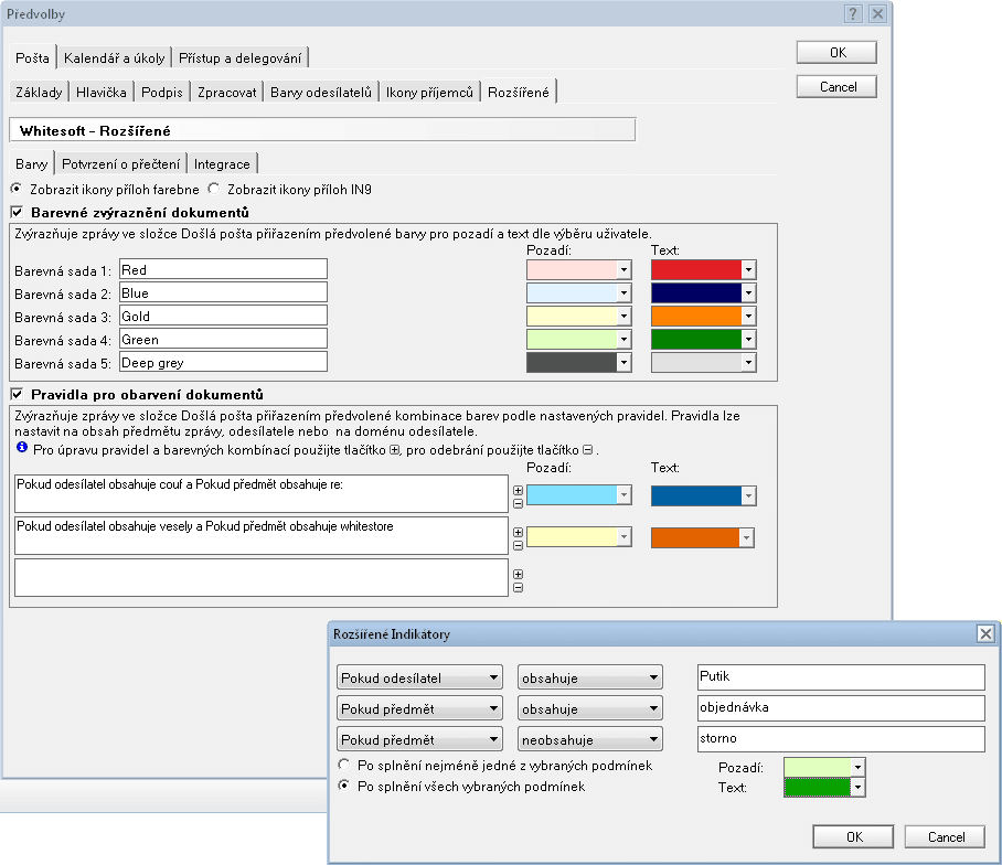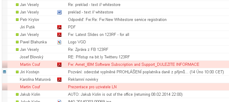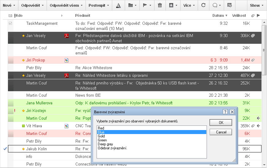 Messages can be highlighted by sender, subject or domain. Criteria are combinable; it means that user can decide whether it is sufficient for the message to fulfill one criterion or all at once to be highlighted. There are three color combinations (text, background) available.